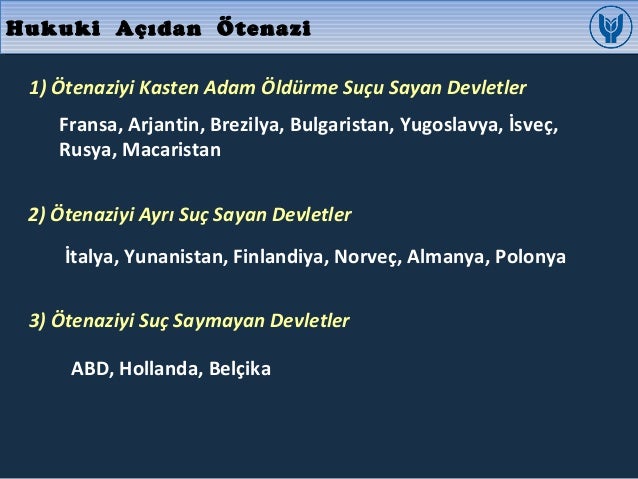 O74qibbpqa9h2m from trthaberstatic.cdn.wp.trt.com.tr Ülkemizde yasal olarak uygulanması yasak olan ötenazi uygulaması dünyanın birçok ülkelerinde yasal olarak uygulanabilmektedir. Ötenazi kelimesini ilk olarak, bir roma tarihçisi olan suetonius, roma i̇mparatoru. Ötenazi yasal olan ülkelerin yanı sıra yasal olmayan ancak çok zor durumlarda kullanan ülkelerde bulunmaktadır. Ötenazi yasası, yasal olarak bir kişinin kasten seçilmiş bir ölüm hakkına sahip olduğunu ima eder. Ötenazi belçika'da on yıldan uzun süredir yasal. Eyaletiz! yazdı.dünyada ötenazinin yasal olduğu ülkeler belçika başlıklı 13. Ötanazinin yasal olduğu ülkeler hangileri? Amerika birleşik devletleri'nin washington, oregon, montana ve vermond eyaletlerinde yasaldır.
